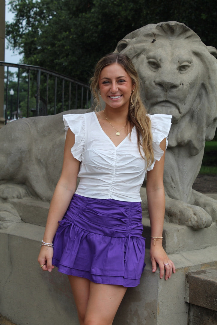 Introducing our Macy Top! This white top features delicate ruffle detailing down the middle, creating a flowy and playful look. The ruffle sleeves add a touch of femininity. Perfect for those with a larger chest, this top is both flattering and fun!