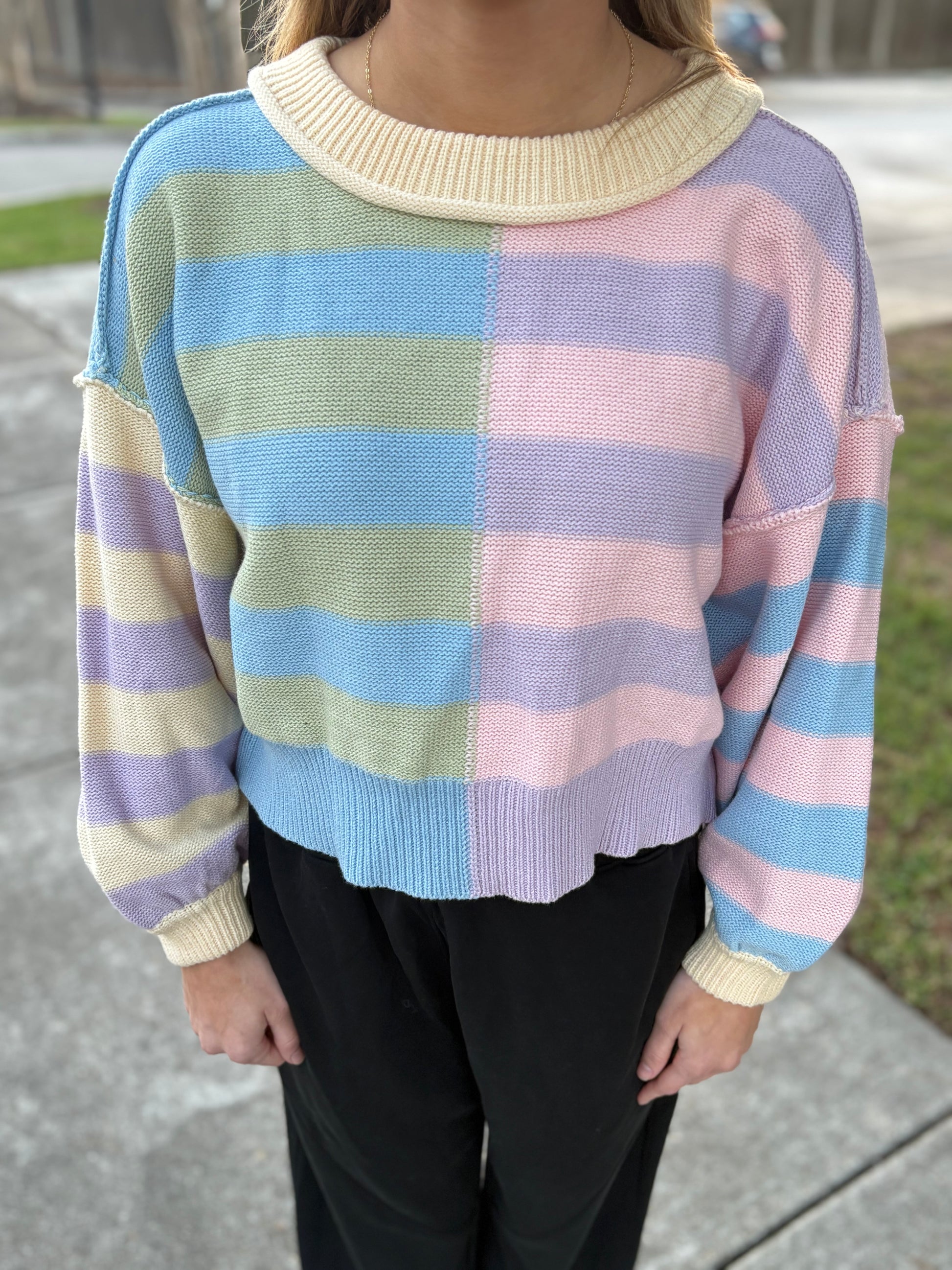 Cozy up in this playful Multicolor Sweater! With its comfy fit and multicolor stripes, this slightly cropped sweater is sure to add a touch of fun to your wardrobe.